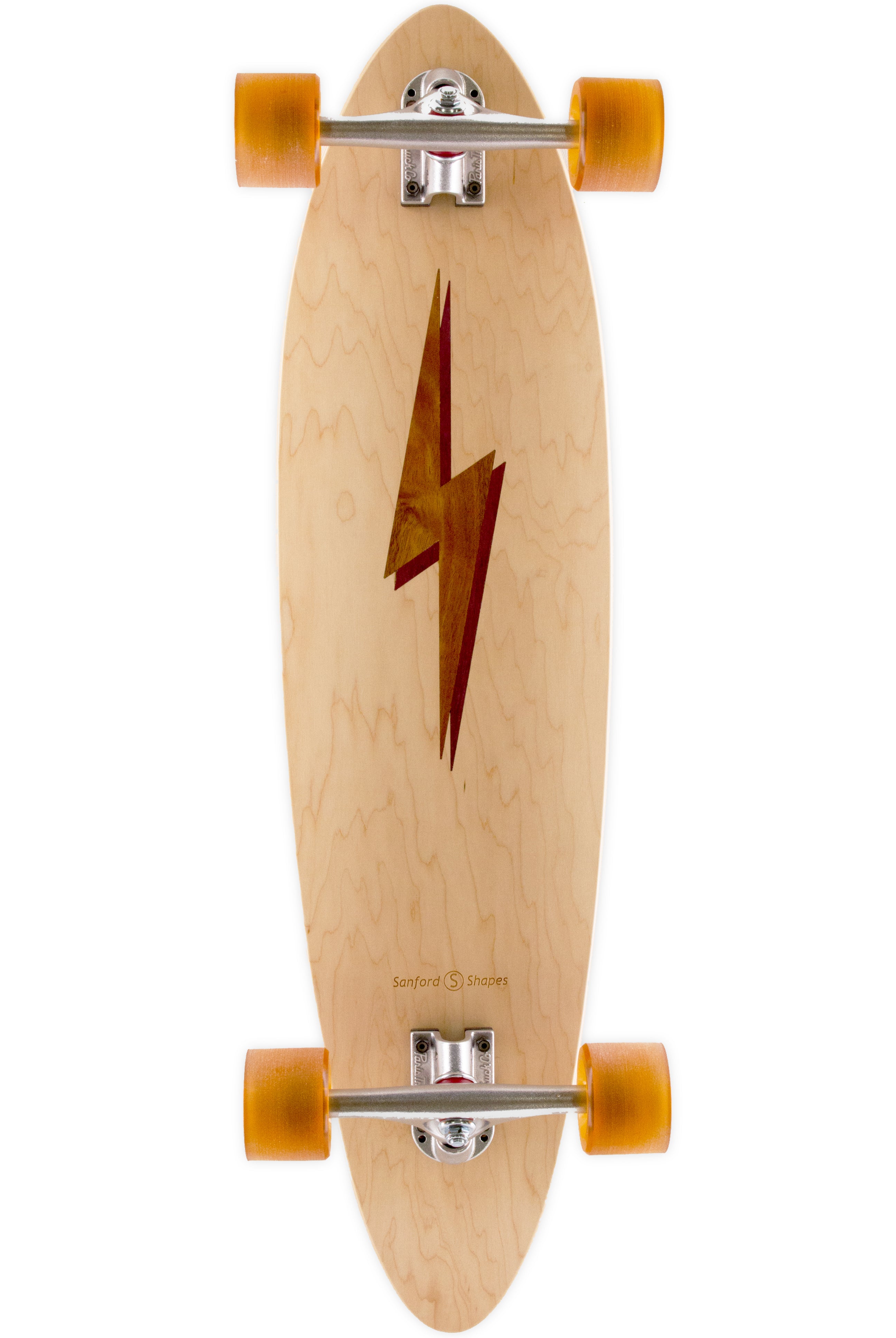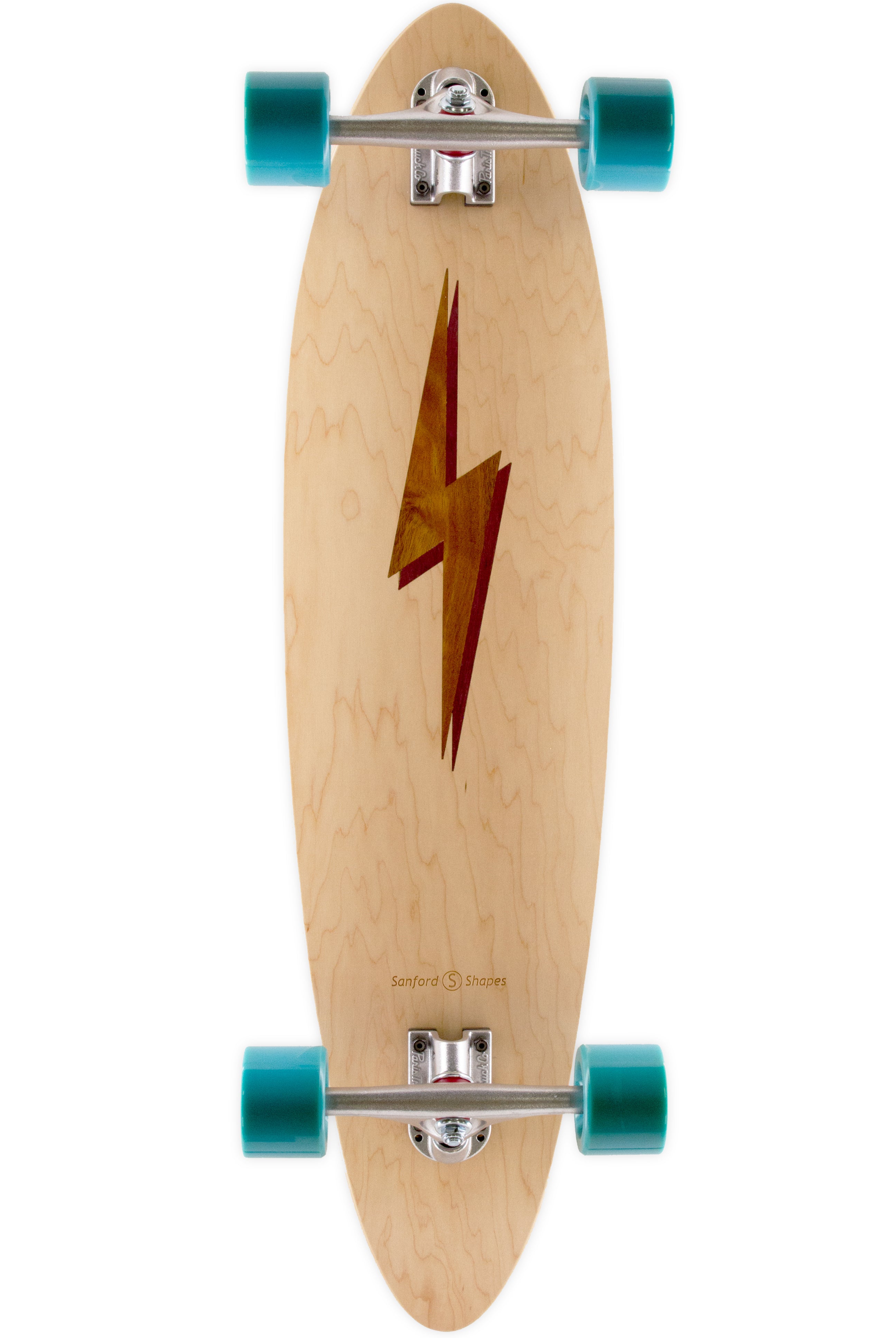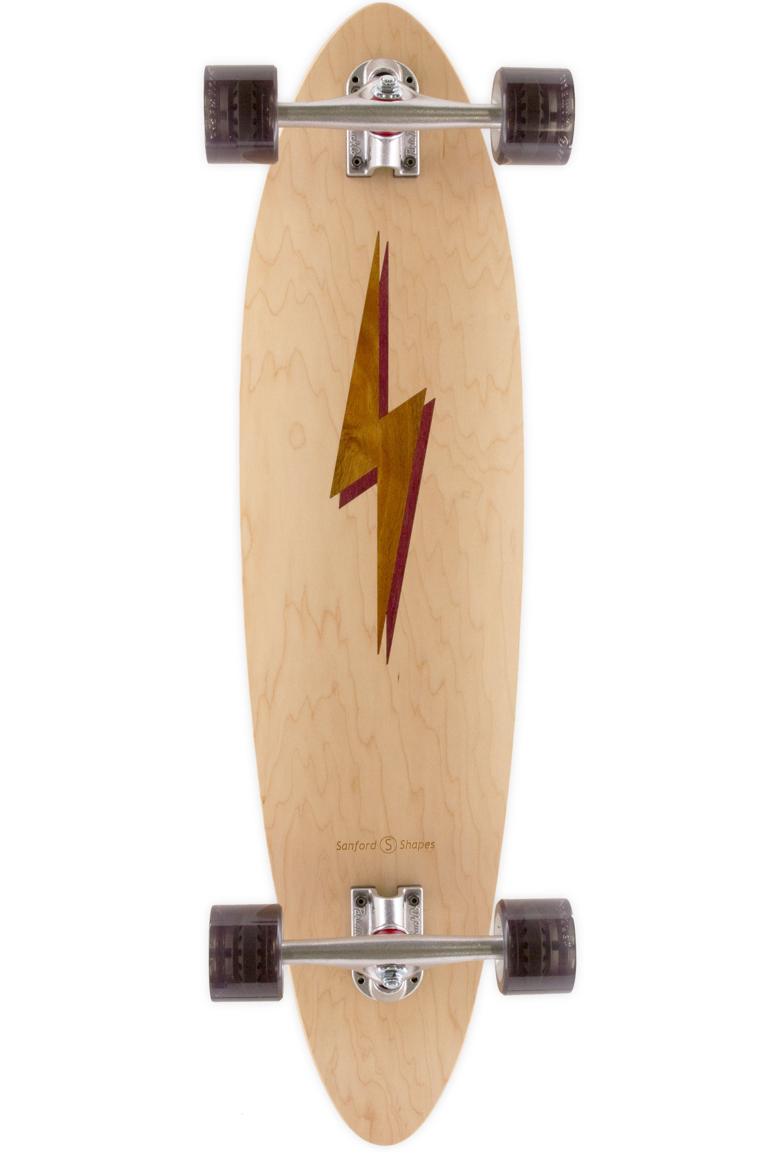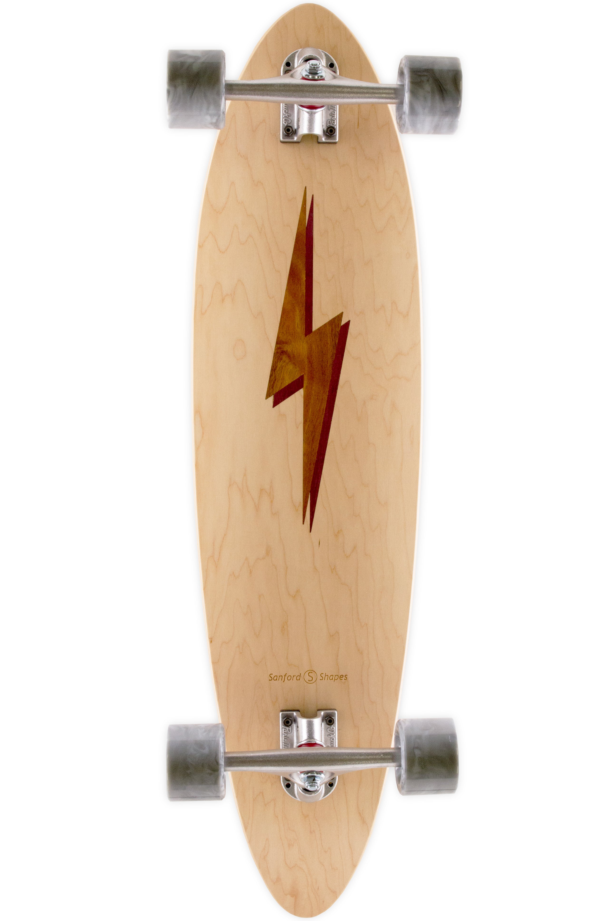 The Mako encompasses the look and feel of a classic longboard. This board is very stable and comfortable, making it easy to ride. Its length and weight make it optimal for long distance rides and smooth carves. The camber in the deck profile gives this board some spring, perfect for those of you hanging 10 or bombing hills. This design features a Koa Bolt inlay with a Purpleheart drop shadow, framed by our Maple veneer. Acacia Koa is a wood species endemic to the Hawaiian Islands. Its name in the Hawaiin language, Koa, also means brave, bold, fearless, or warrior. Get electric with our bolt design!