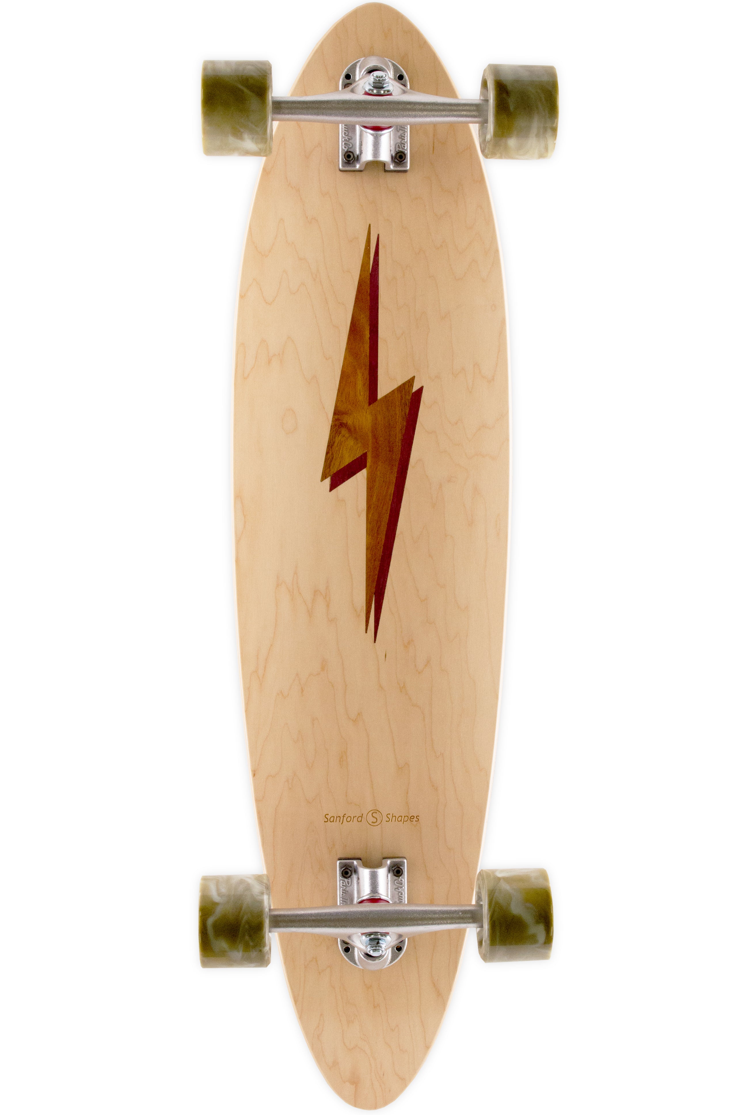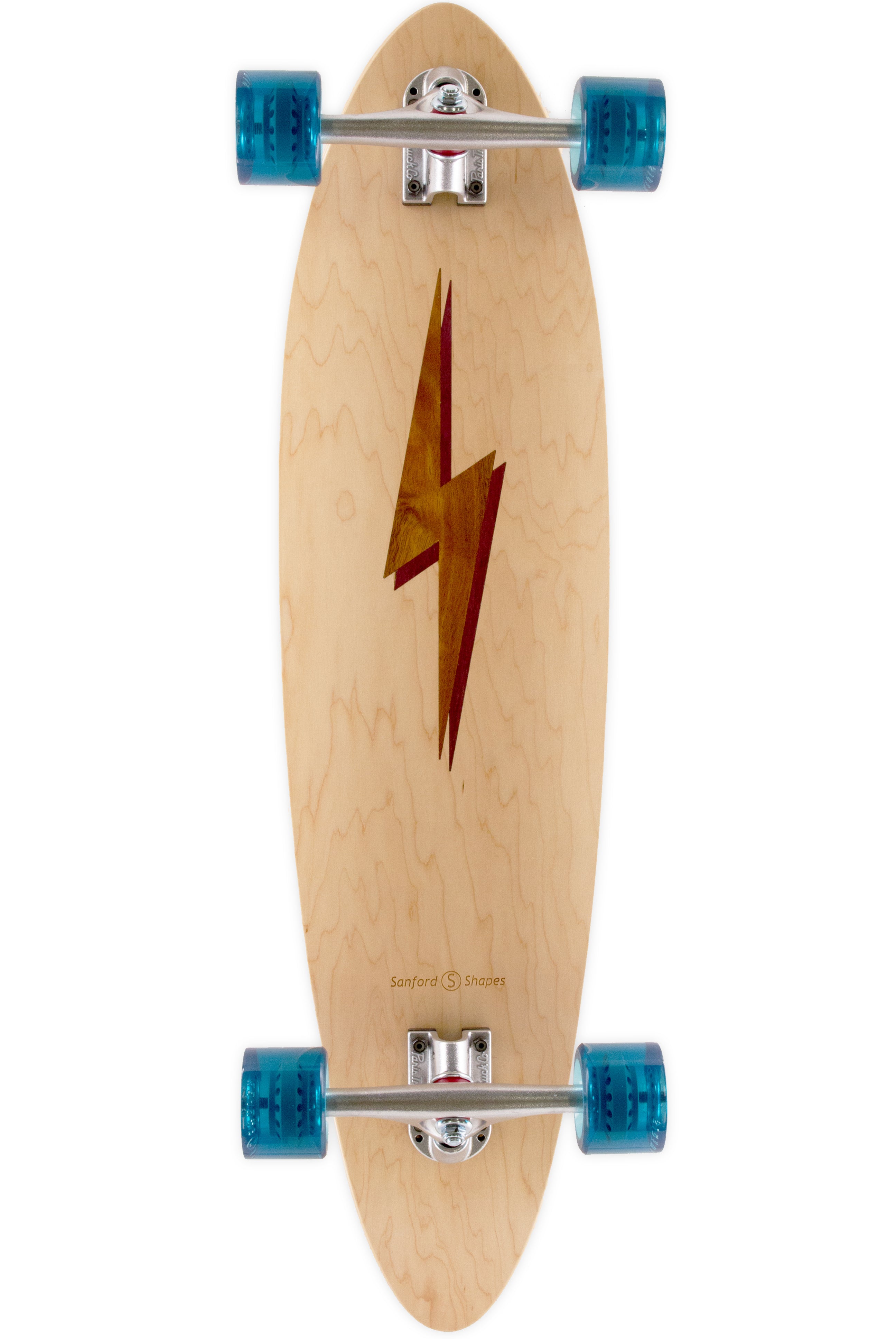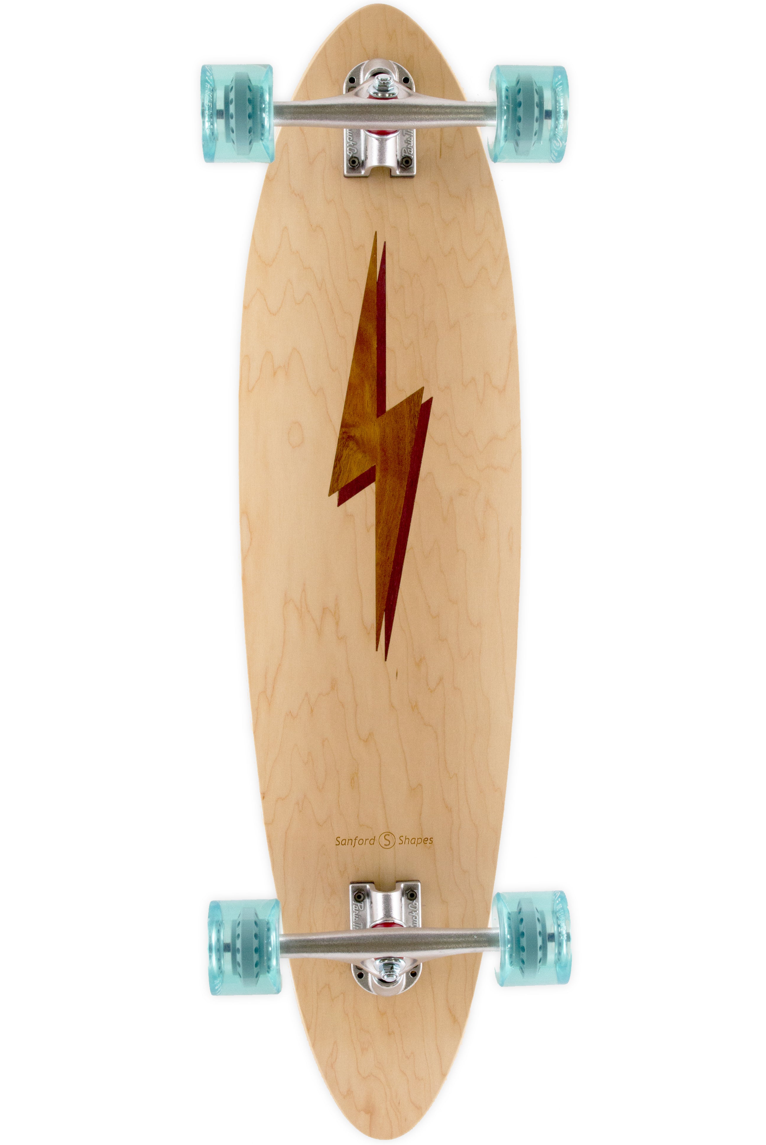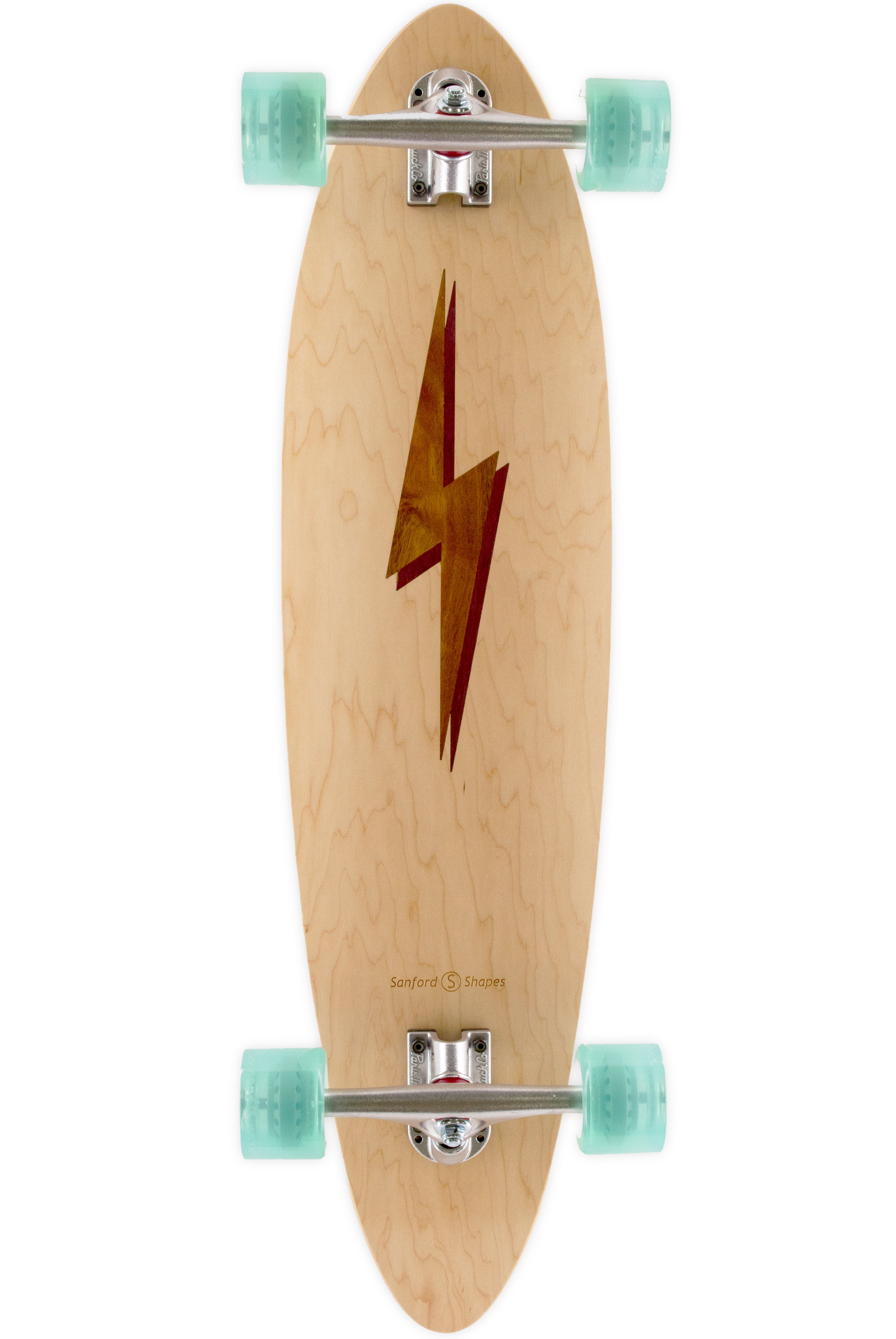 The Mako encompasses the look and feel of a classic longboard. This board is very stable and comfortable, making it easy to ride. Its length and weight make it optimal for long distance rides and smooth carves. The camber in the deck profile gives this board some spring, perfect for those of you hanging 10 or bombing hills. This design features a Koa Bolt inlay with a Purpleheart drop shadow, framed by our Maple veneer. Acacia Koa is a wood species endemic to the Hawaiian Islands. Its name in the Hawaiin language, Koa, also means brave, bold, fearless, or warrior. Get electric with our bolt design!