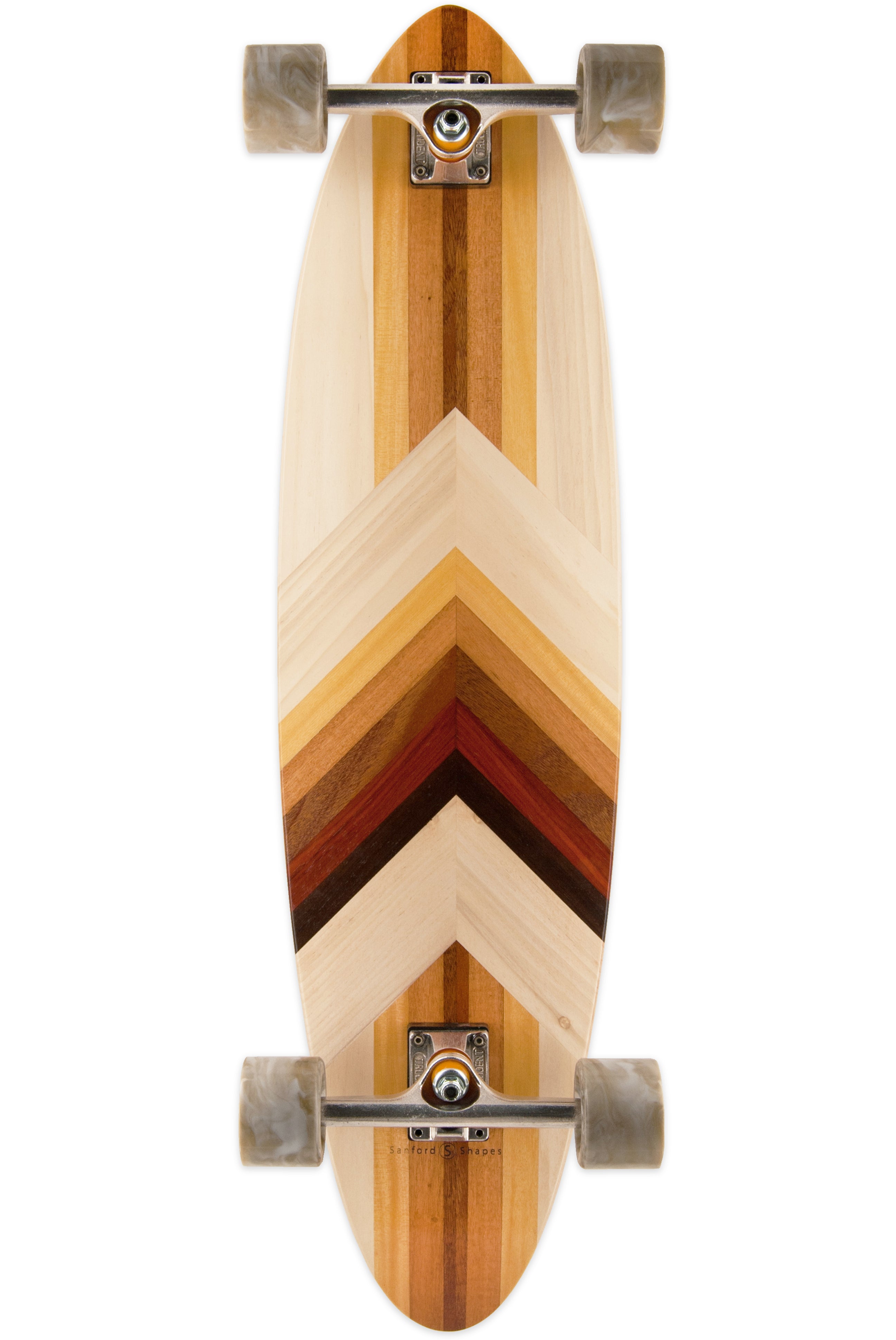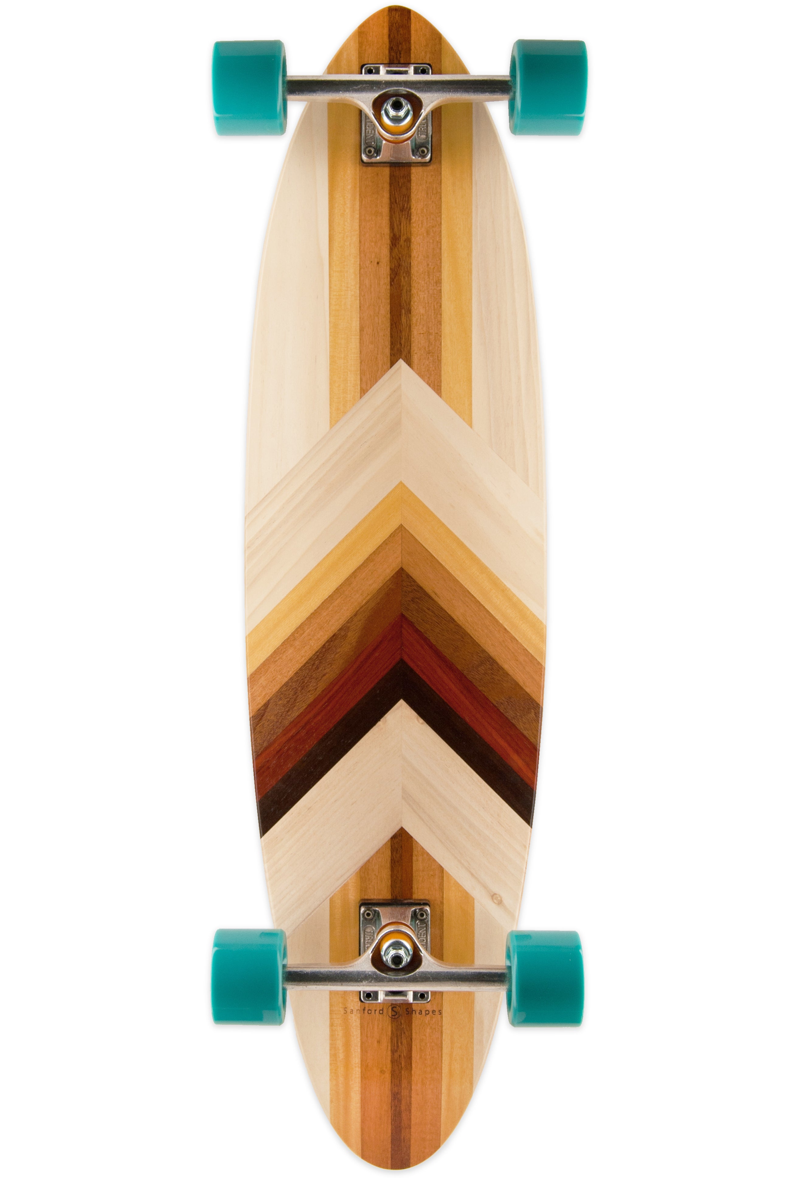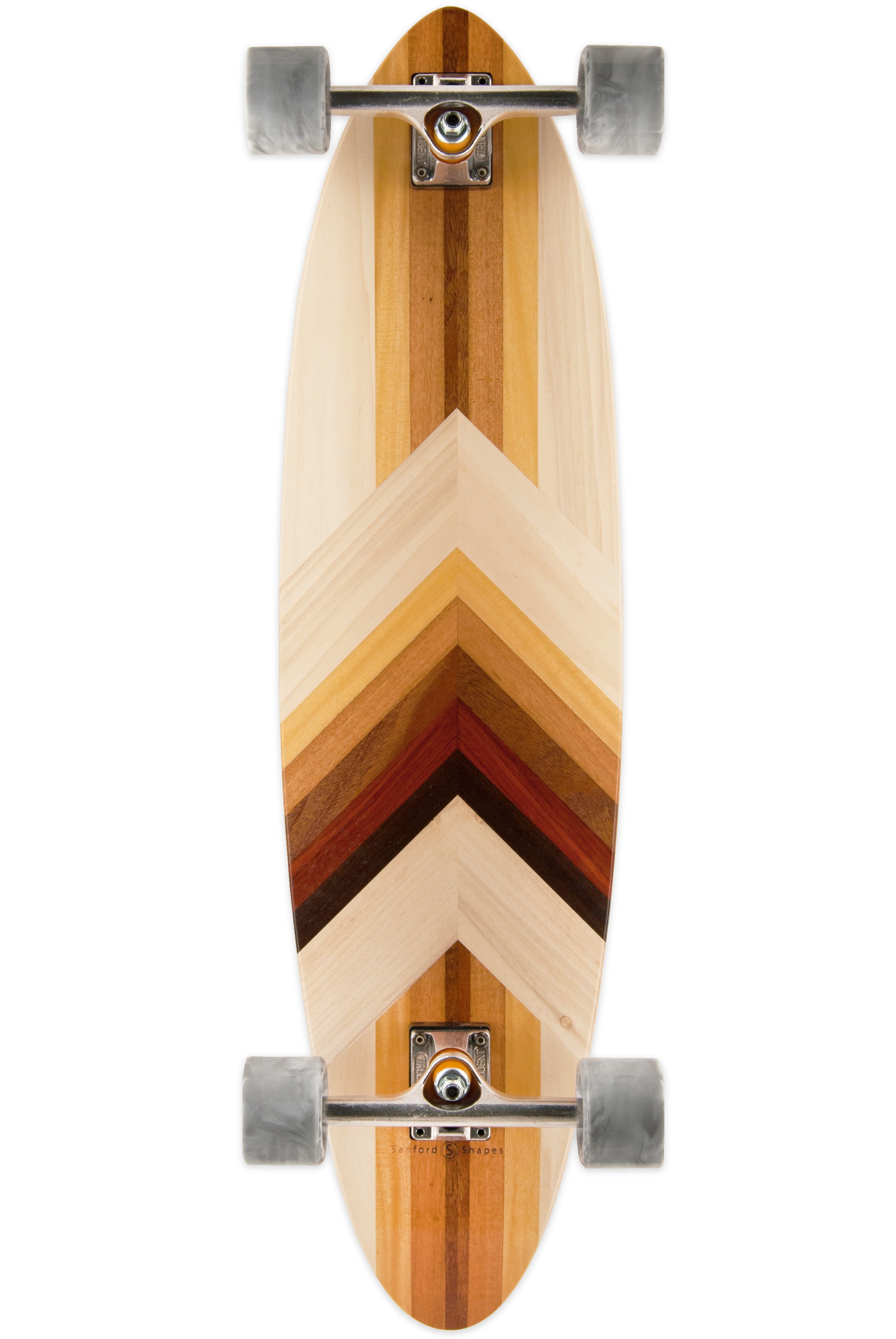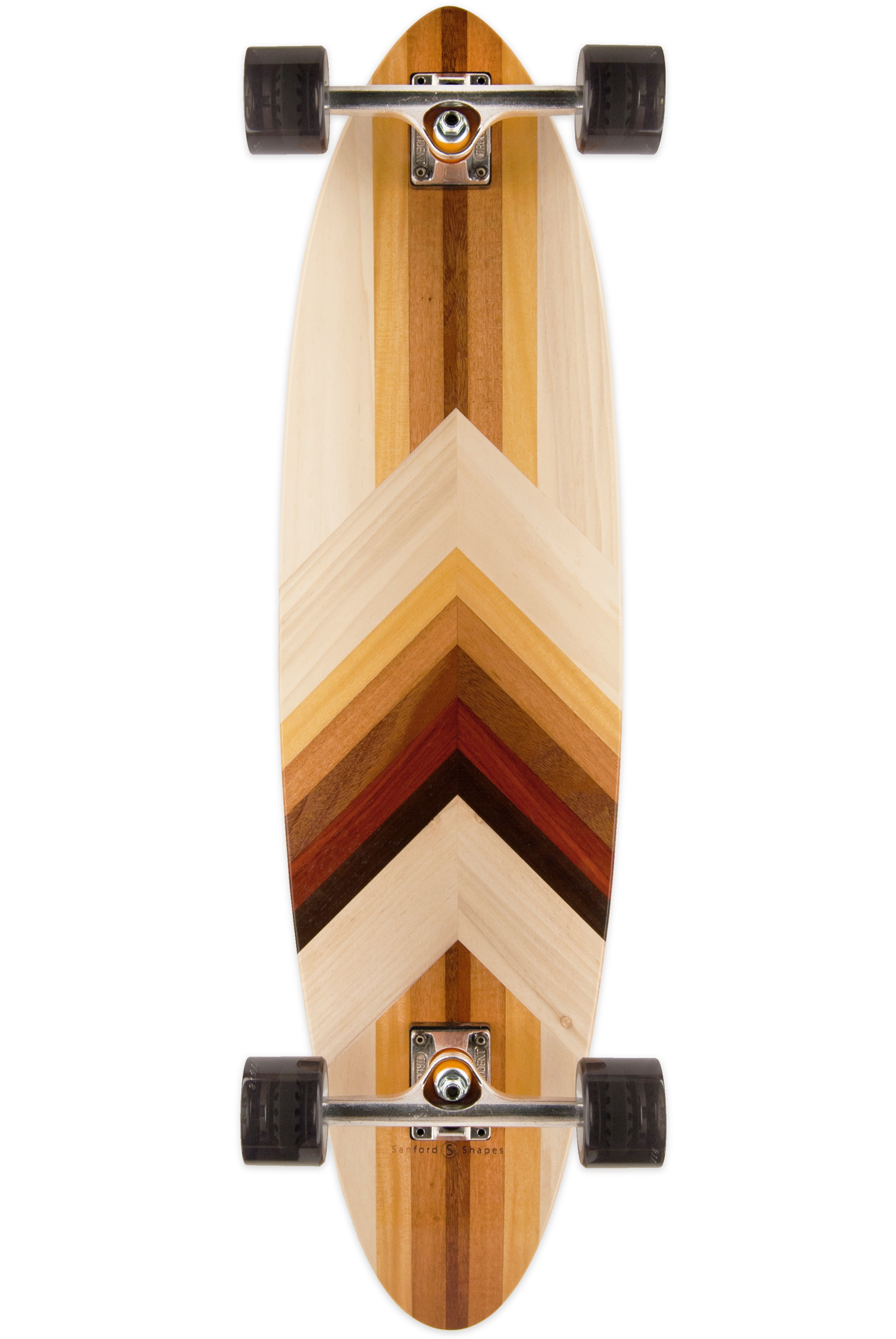 The Mal essentially takes all of the features of the Mako, and enhances it. This board is heavy duty. It is stable, comfortable, and can handle just about anything. The camber in the deck profile provides some flex, perfect for those of you walking the nose. Great for long distance rides and smooth drawn out carves. A spin-off of our Lineup design, the Stick Shift Yellowheart features Walnut, Padauk, Goncalo, Yellowheart, and Poplar. Add some color to your cruising with this festive pattern.