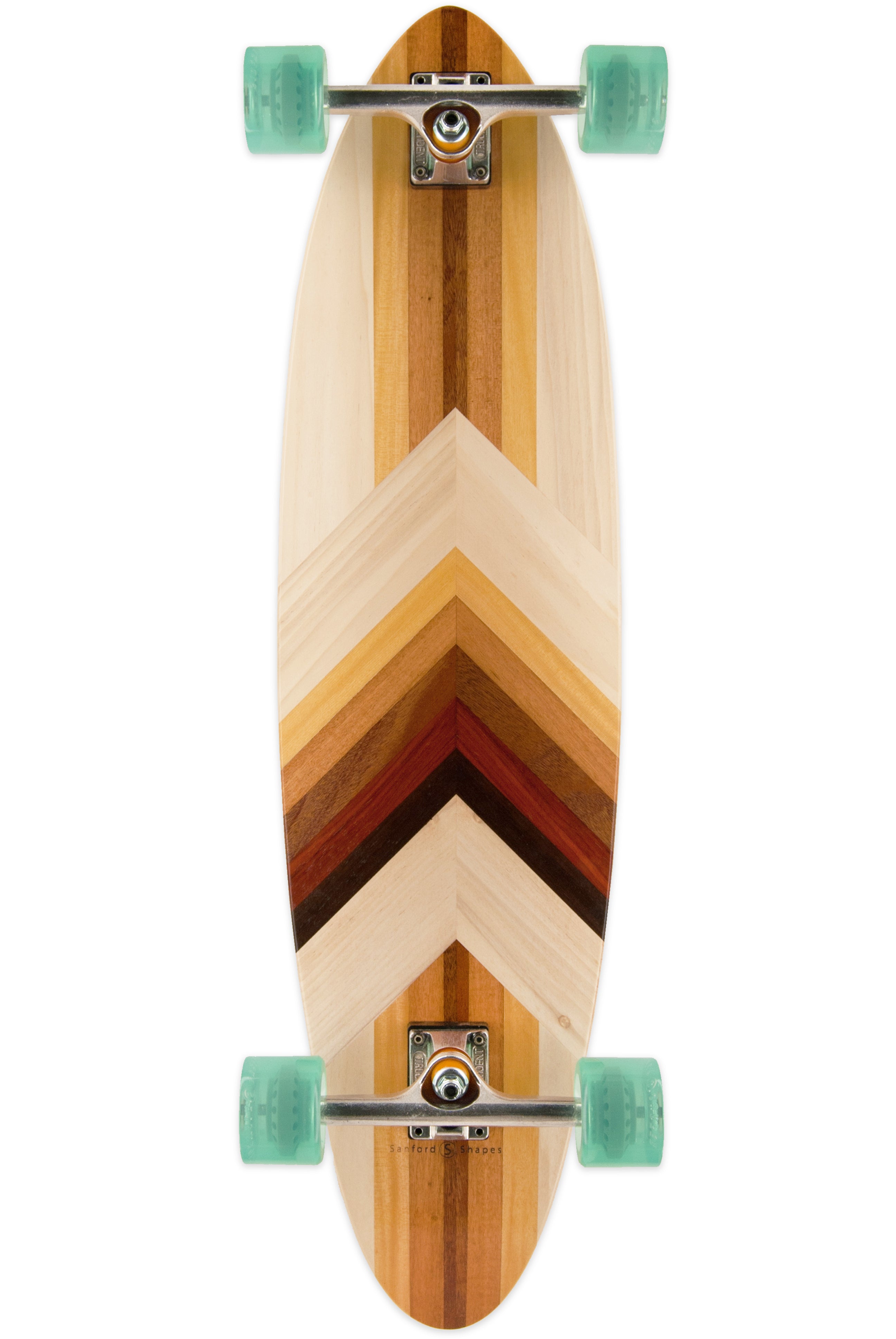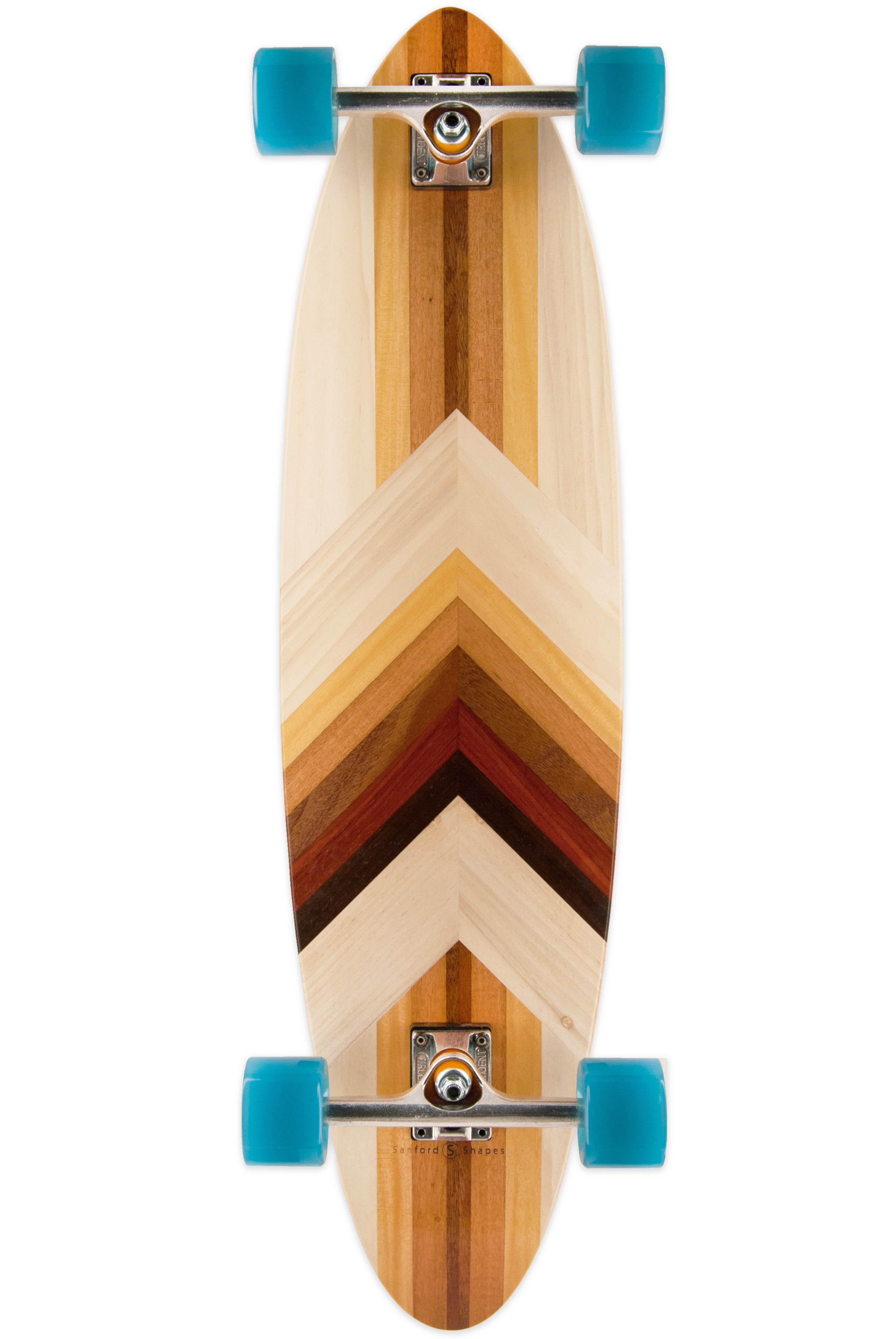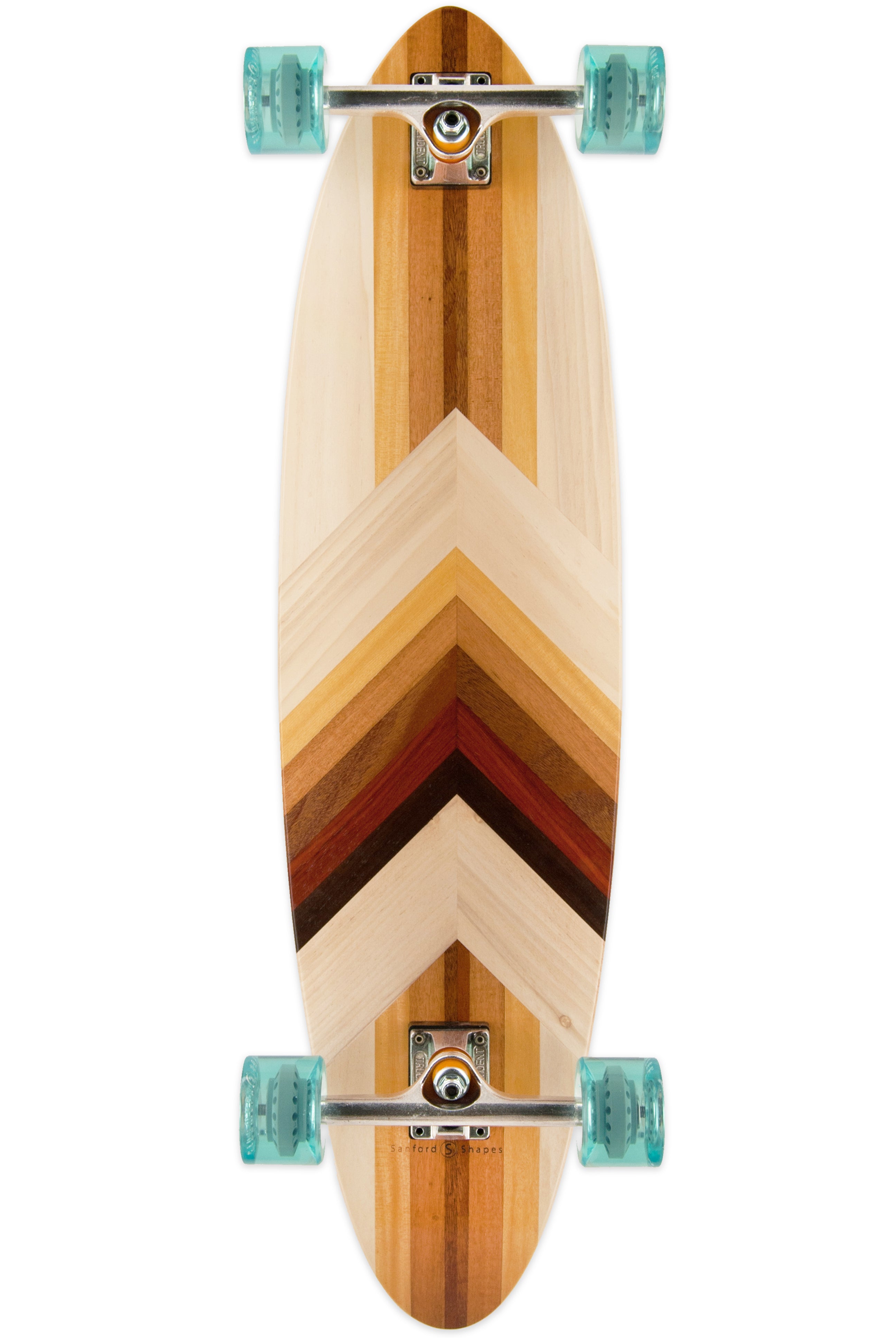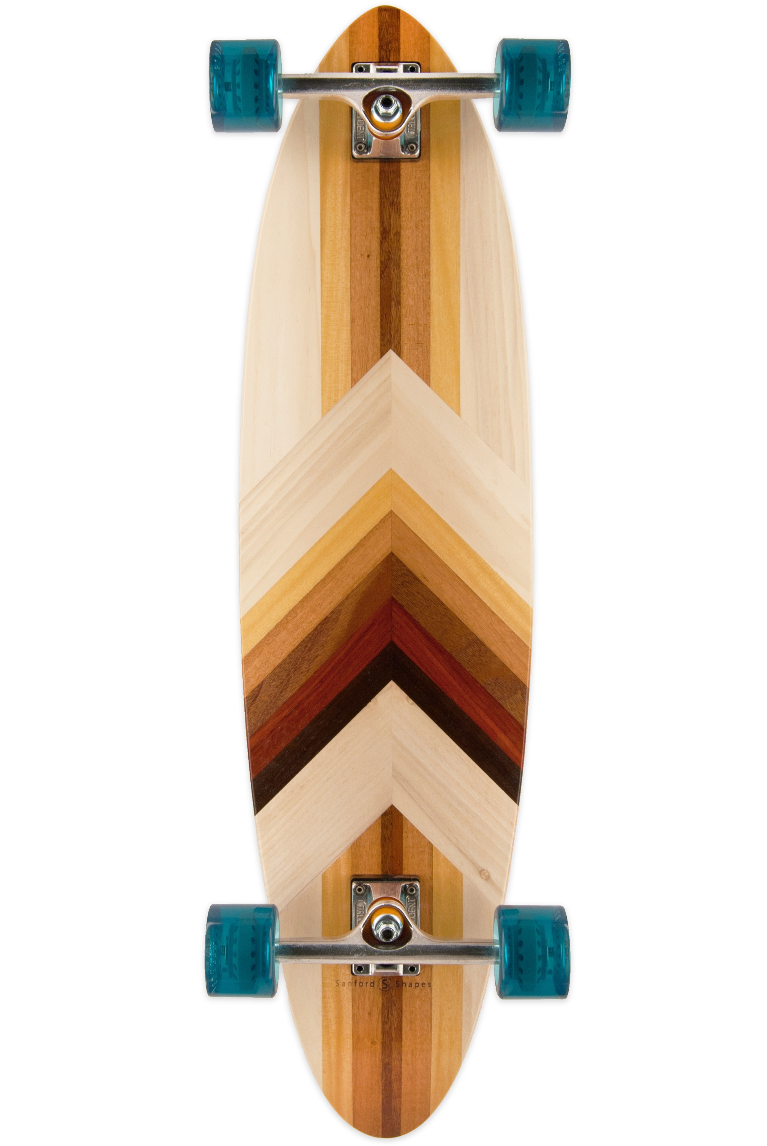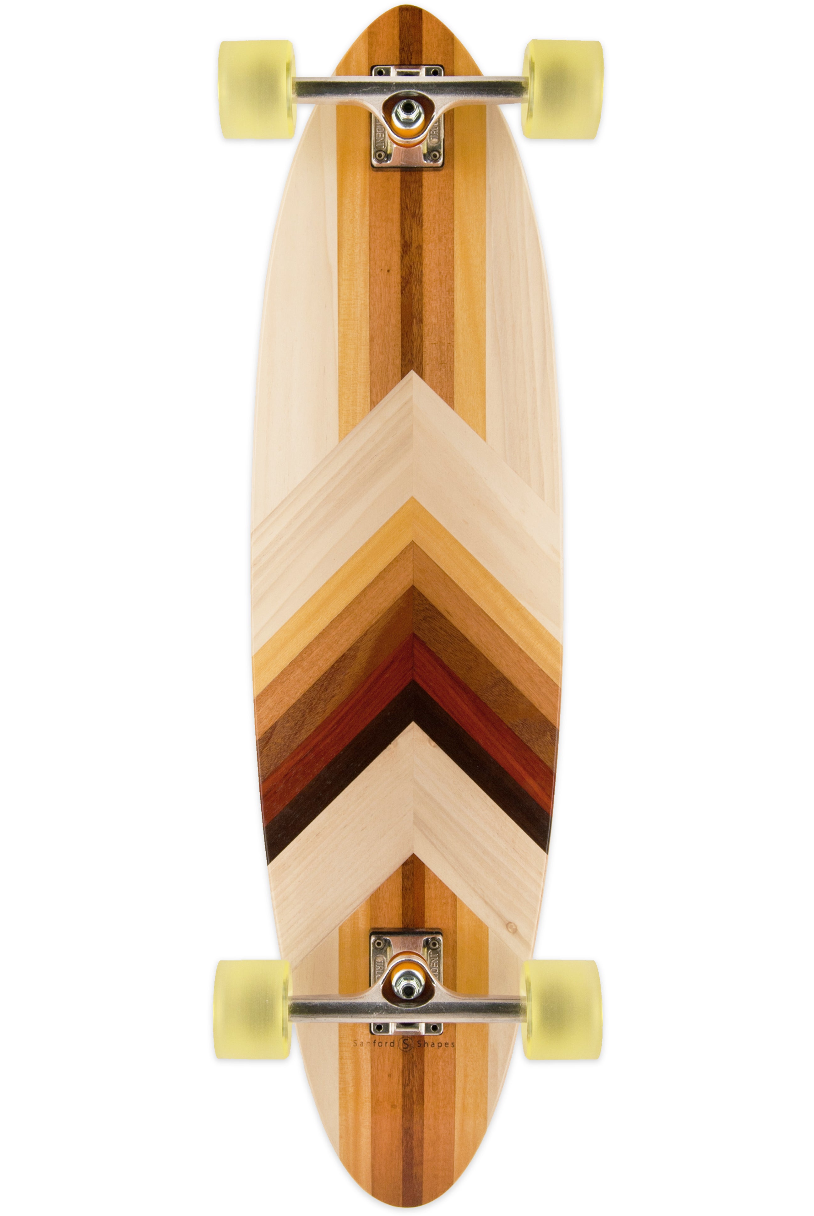 The Mal essentially takes all of the features of the Mako, and enhances it. This board is heavy duty. It is stable, comfortable, and can handle just about anything. The camber in the deck profile provides some flex, perfect for those of you walking the nose. Great for long distance rides and smooth drawn out carves. A spin-off of our Lineup design, the Stick Shift Yellowheart features Walnut, Padauk, Goncalo, Yellowheart, and Poplar. Add some color to your cruising with this festive pattern.