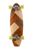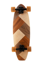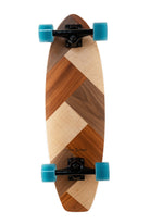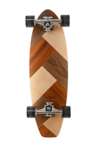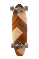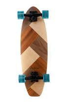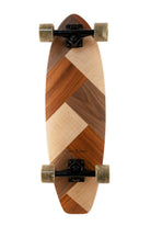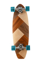 A clean, compact mini-cruiser. You can strap this complete skateboard to your backpack and stash it in a locker. The Tuna being our smallest board, is the most lightweight, compact, and easy to turn cruiser. Its small size and squared off tail provides quick and snappy mobility. Because this board is highly maneuverable, it is optimal for kids or anyone with a little bit of experience. This design features one of our original designs, Dreamweaver. A cross weave pattern with a combination of beautiful wood species: Walnut, Maple, and the rich color of Goncalo.